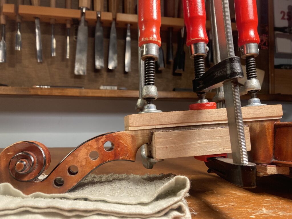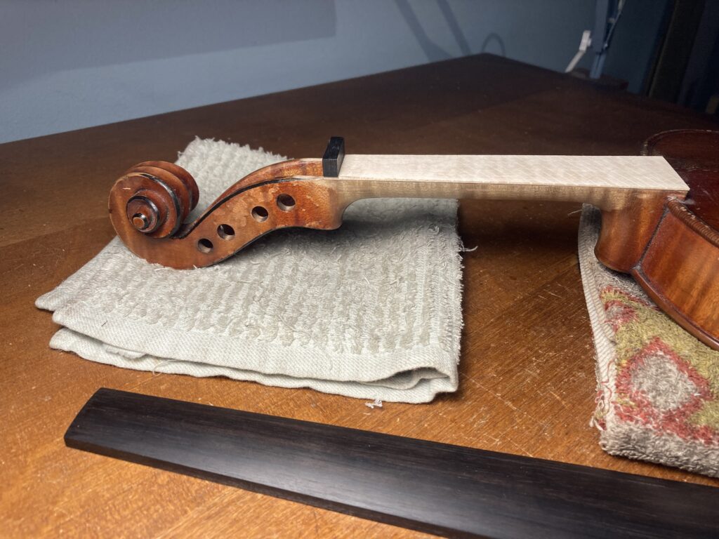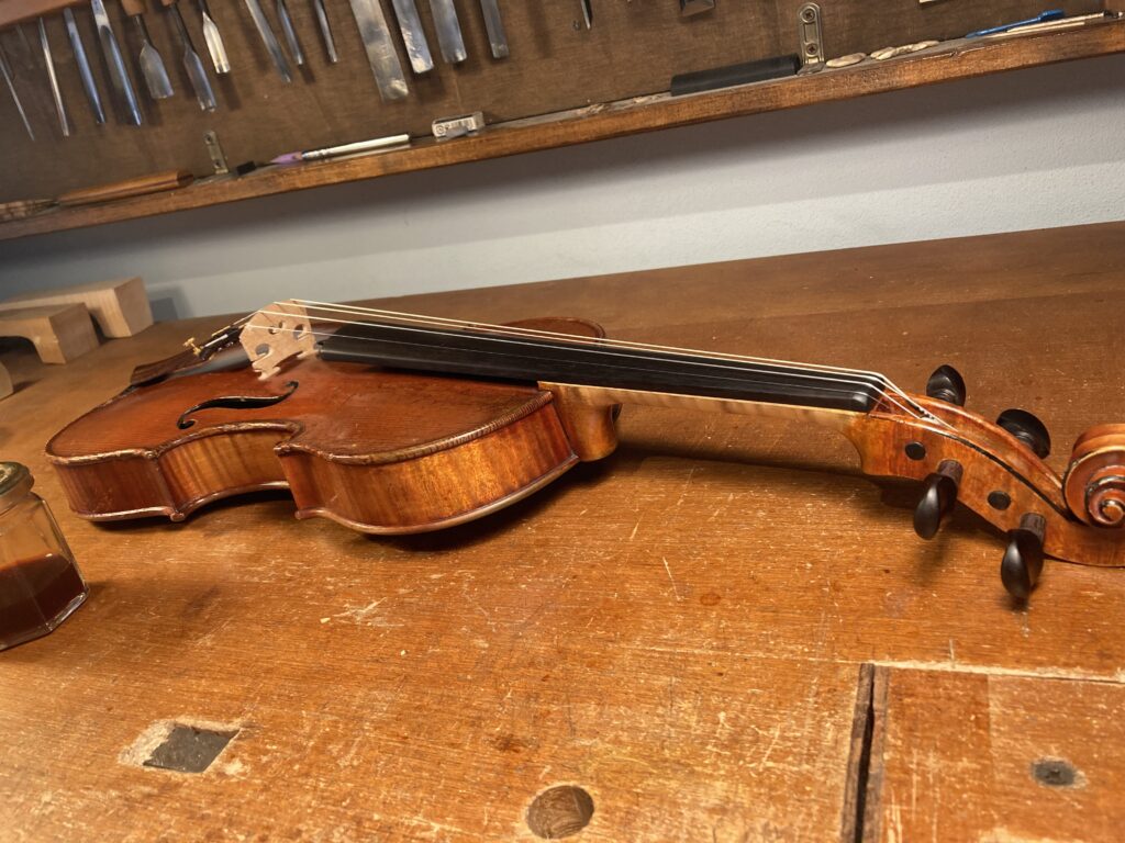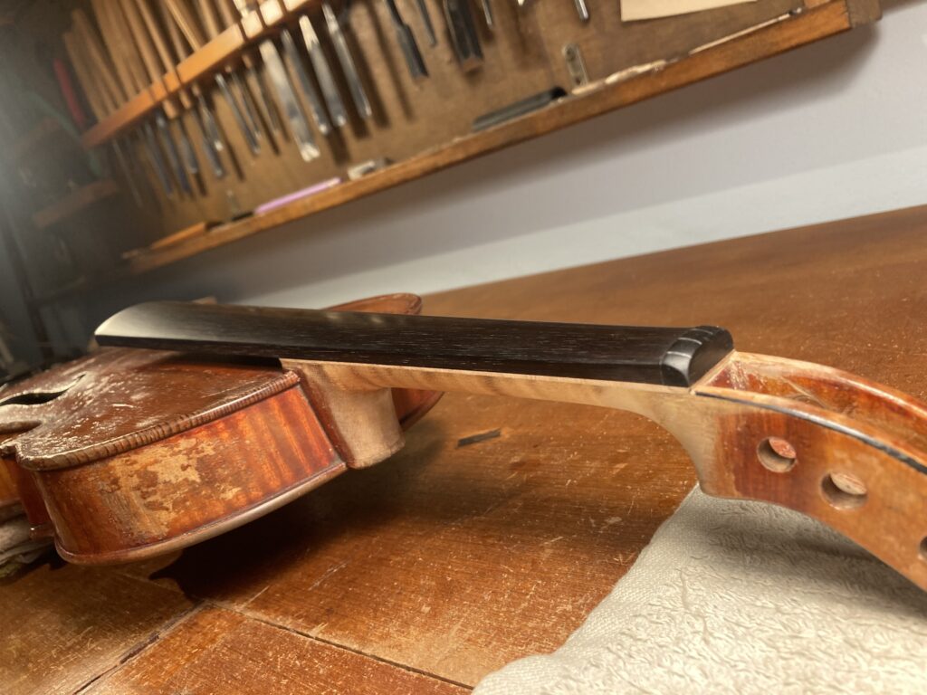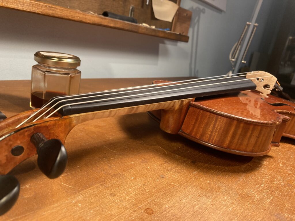 バイオリンの指板の交換及びニスの修復 2026年3月3日 最終更新日時 : 2026年3月3日 admin@atsu-liutaio 指板が薄くなり弾きづらいのと強度が心配されるので指板を作り直し ネック自体の厚みも調整しました。 ニスの修復は楽器自体のused感がそのまま出るように色をつけました。